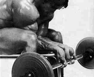 (1) Возьмите штангу нижним хватом, сблизив руки, насколько это возможно. Сядьте "верхом" на скамью и расставьте ноги так, чтобы ваши локти и предплечья находились на скамье, но запястья выглядывали за край скамьи. Зажмите локти коленями для устойчивости. (2) Согните запястья и опустите штангу к полу. В нижней точке движения осторожно разогните пальцы и дайте штанге скатиться еще ниже, к фалангам пальцев. Затем перекатите штангу обратно, напрягите предплечья и поднимите снаряд так высоко, как только можете, не отрывая предплечья от скамьи. Как и икры, предплечья нуждаются в очень активной стимуляции для роста, поэтому не бойтесь нагружать их по полной программе.